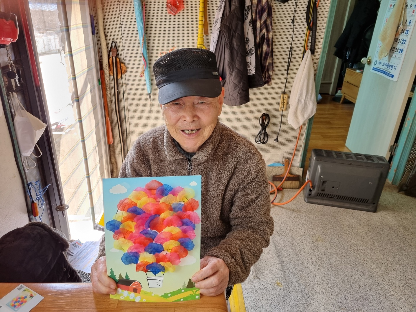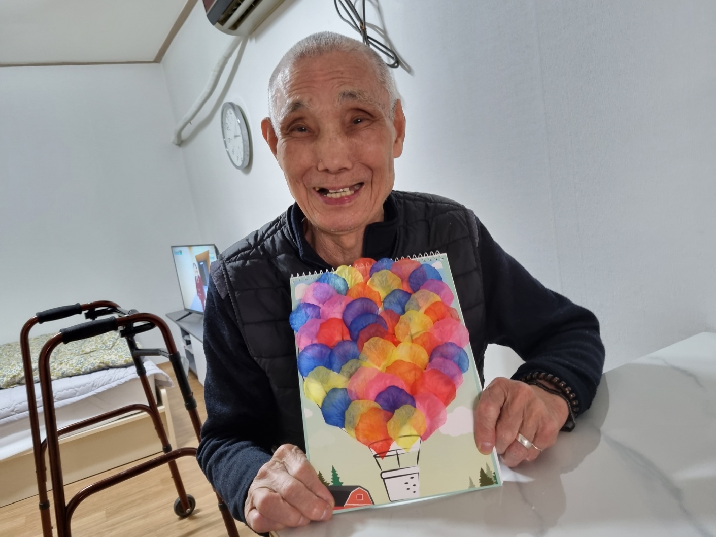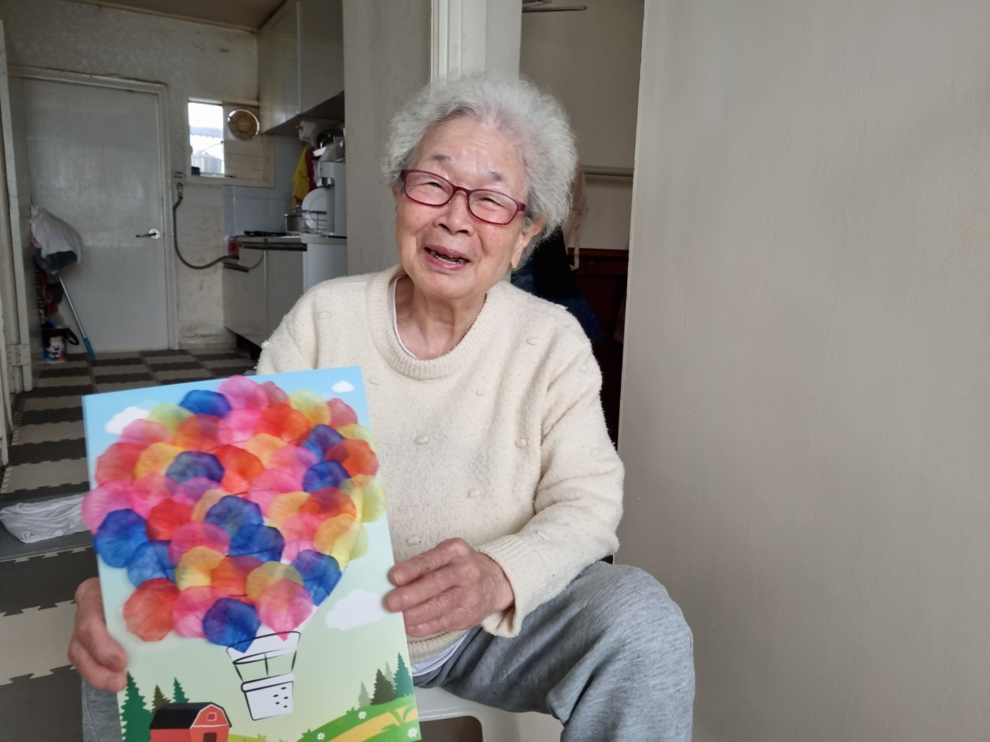 법원읍에 거주하는 김ㅇㅇ어르신은 양면테이프를 사용하여 열기구 도안에 빨간색 꽃잎, 노란색 꽃잎, 분홍색 꽃잎을 붙여 알록달록 완성된 작품을 보시며 “열기구를 타고 훨훨 날아다니면 재미있을 것 같다~”고 하시며 긍정적인 반응을 보이셨습니다.